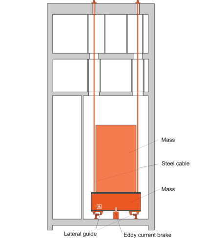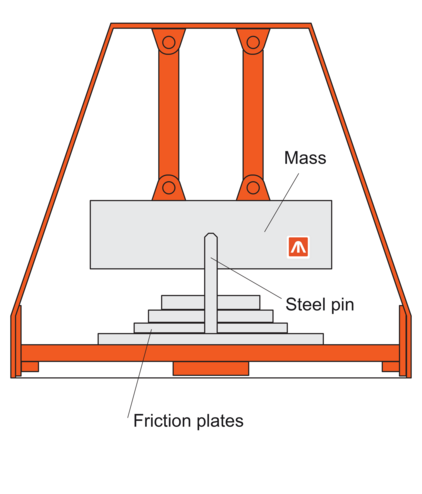 The MTMD-P consists of a mechanical pendulum on which the steel mass is suspended. Friction plates for damping are activated by means of a steel pin on the mass underside. Vibration frequency is determined by the length of the pendulum. This can be adjusted using tuning springs for up to ± 15% frequency tolerance.