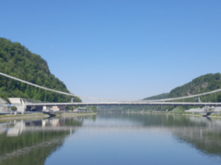 Die 305,55 m lange und 22,5 m breite Brücke ist in Österreich die einzige Hängebrücke über die Donau – und sie ist eine echte Hängebrücke: Die 500 m langen Tragseile sind direkt im Fels verankert, die Auf- und Abfahrtsrampen liegen in Tunnels, welche nördlich und südlich an die Brücke anschließen. Diese längste erdverankerte Hängebrücke schwebt elegant über der Donau; sie besitzt keine Pfeiler.